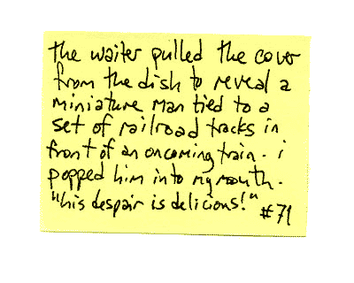 The waiter pulled the cover from the dish to reveal a miniature man tied to a set of railroad tracks in front of an oncoming train. I popped him into my mouth. "his despair is delicious!"